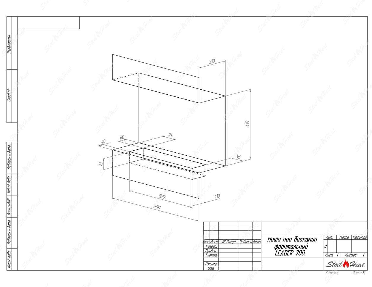 Встраиваемый Биокамин фронтальный SteelHeat Leader 700 предназначен для встраивания в глухие ниши из гипсокартона, кирпича, пеноблоков, бетона.
