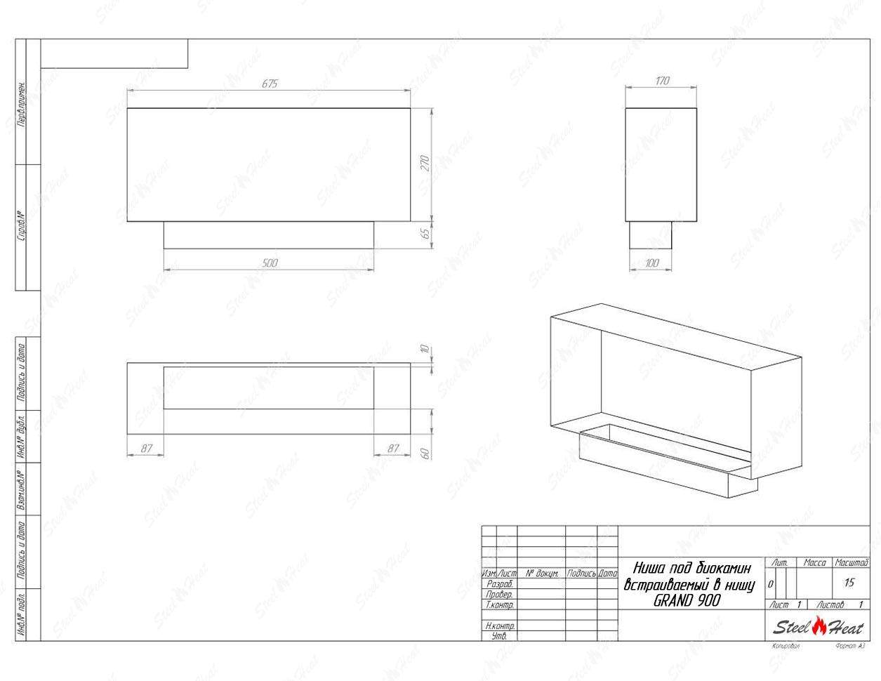 Встраиваемый Биокамин SteelHeat GRAND 900 предназначен для встраивания в глухие ниши из гипсокартона, кирпича, пеноблоков, бетона.