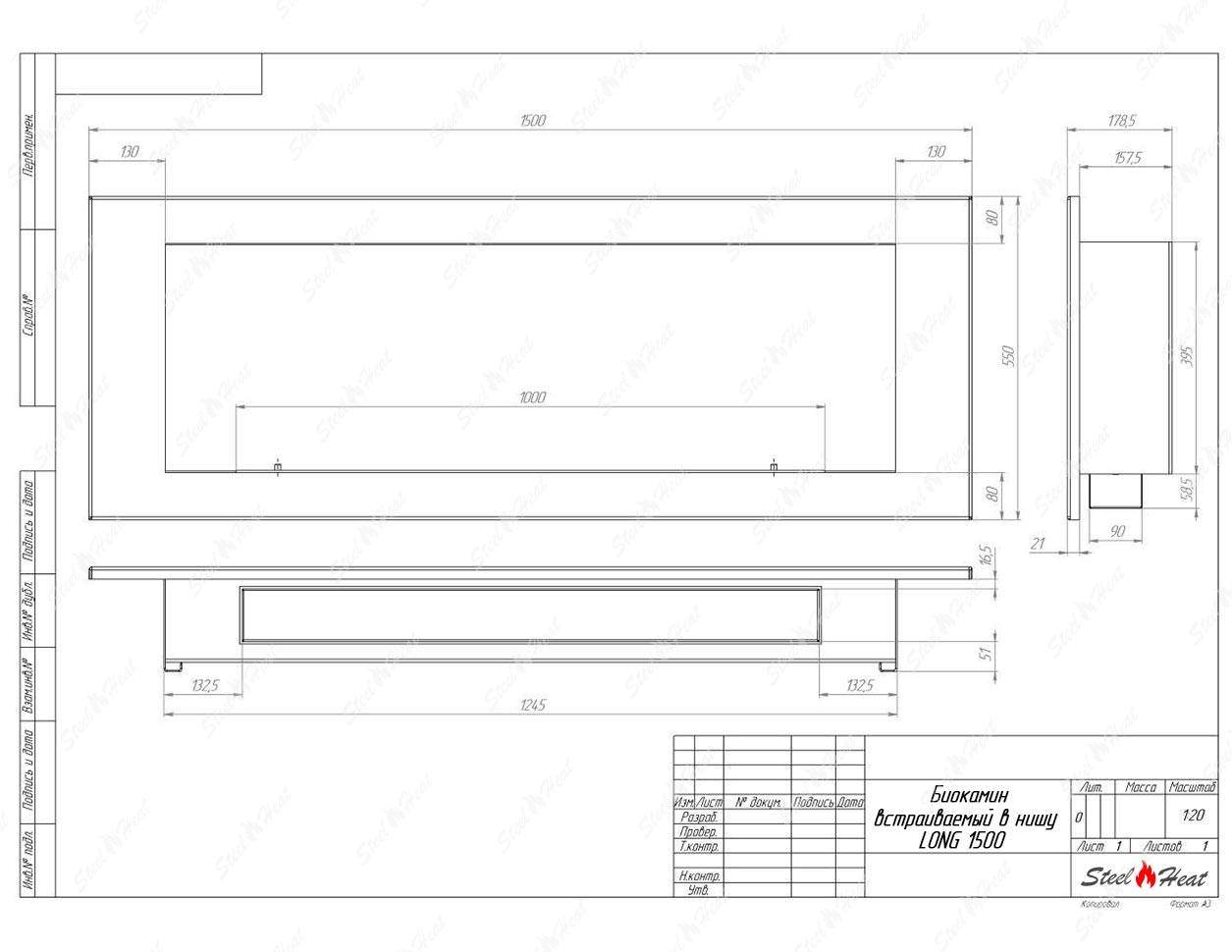 Встраиваемый Биокамин SteelHeat LONG 1500 предназначен для встраивания в глухие ниши из гипсокартона, кирпича, пеноблоков, бетона.