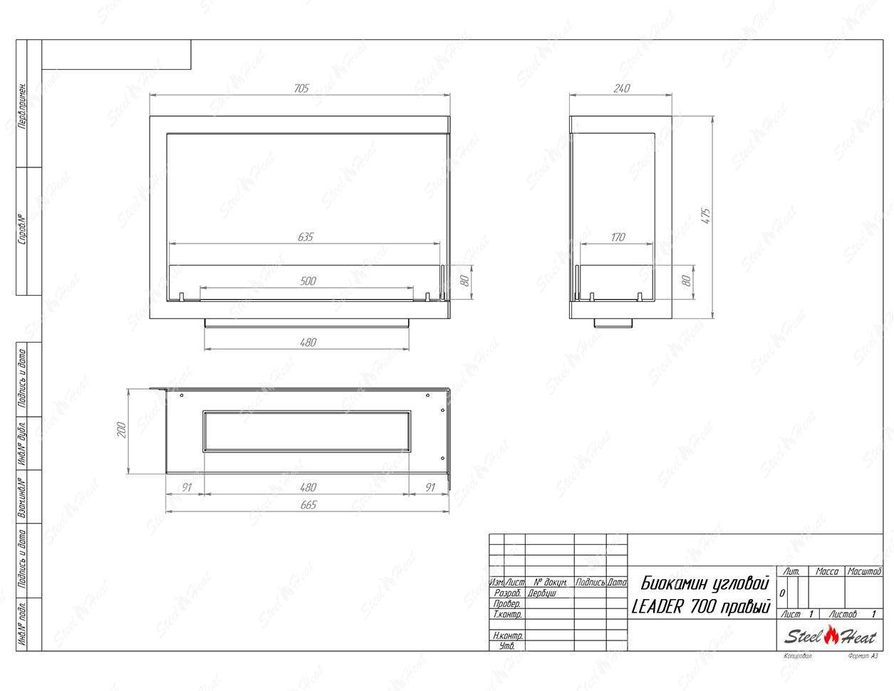 Встраиваемый Биокамин угловой SteelHeat Leader 700 правый предназначен для встраивания в глухие ниши из гипсокартона, кирпича, пеноблоков, бетона.