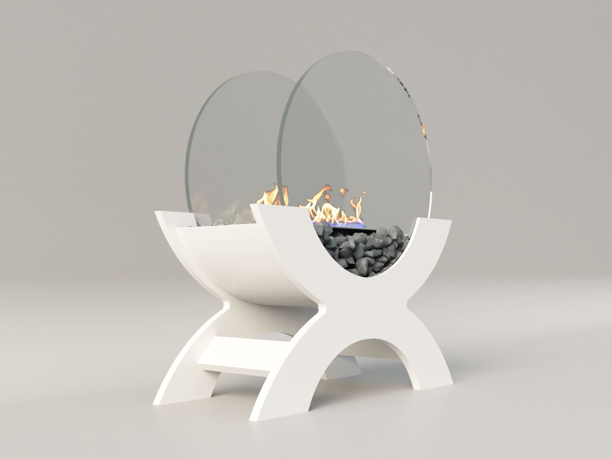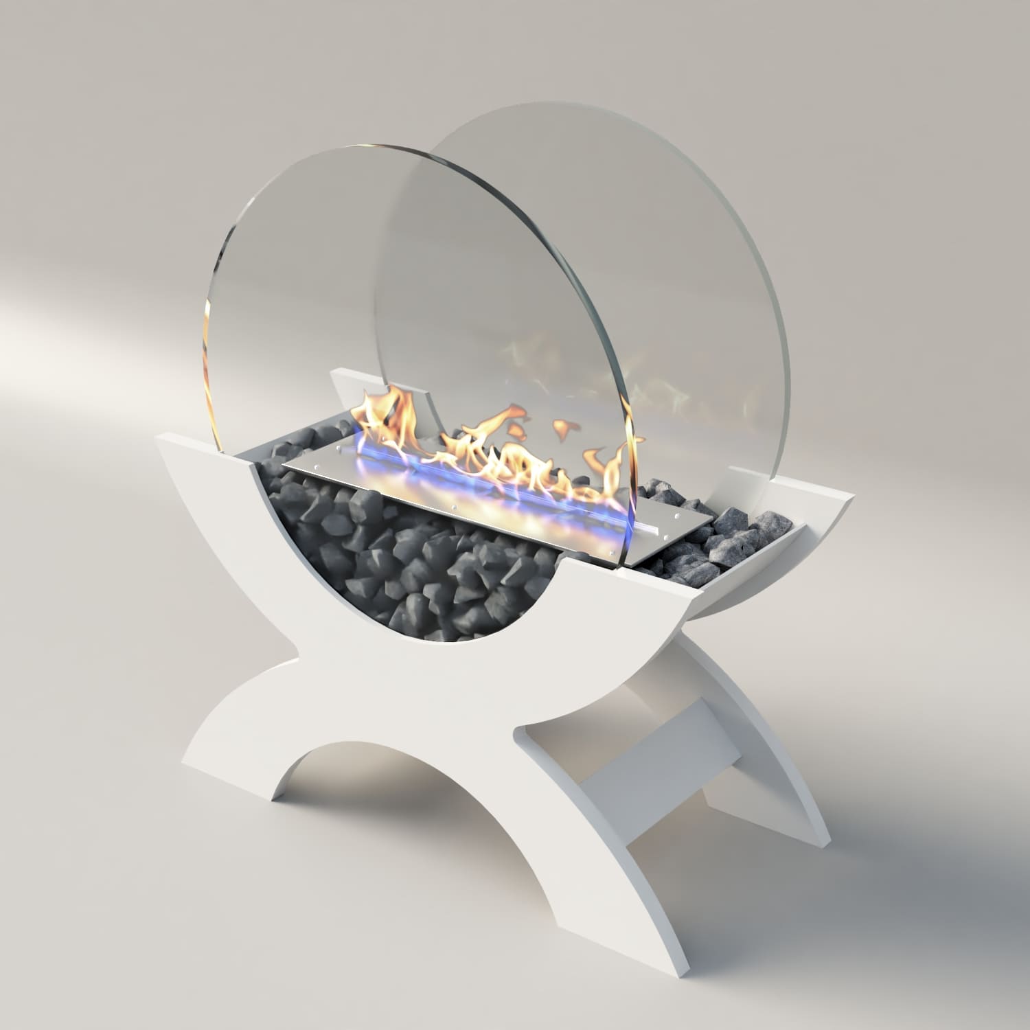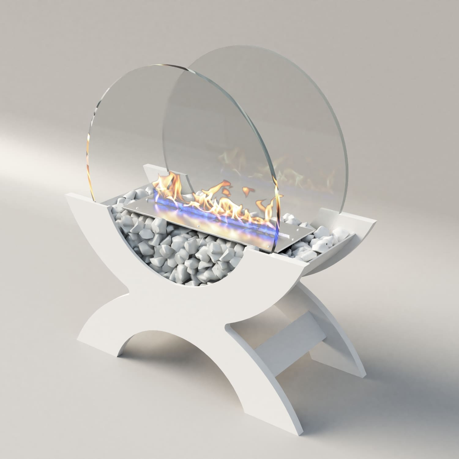 Переносной камин устанавливается на полу и не требует дымохода. Линия огня данного камина 300 мм, располагается практически по всей длине камеры сгорания. Основание биокамина — 100% сталь, ножки изготовлены из МДФ, топливный блок выполнен из высококачественной нержавеющей стали, наполнитель — керамическое волокно, а также закаленные жаропрочные стекла толщиной 6 мм, камни — галтованный мрамор.