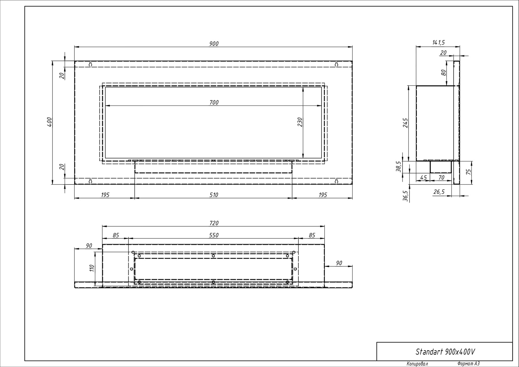 Встраиваемый биокамин «Барокко 900V» изготовлен из стали, нержавеющей стали и латуни, окрашен термостойкой порошковой краской.