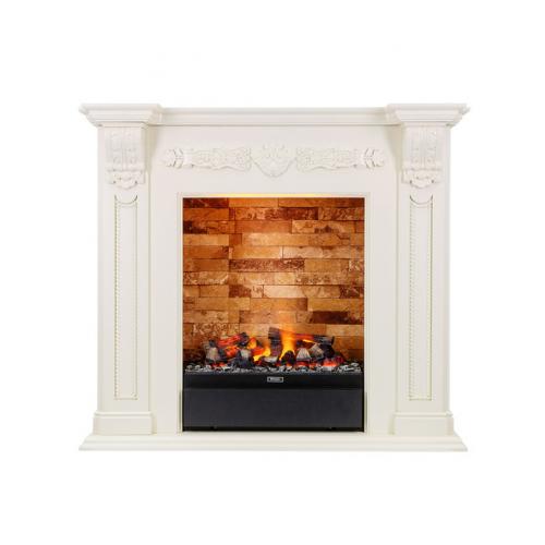 При изготовлении портала каминокомплекта использован МДФ, который по характеристикам приближен к натуральной древесине. Отличительной же его особенностью является значительно меньшая стоимость и устойчивость к перепадам параметров микроклимата. Поэтому можно не переживать, что со временем портал перекосится или покроется трещинами. Дополнительную защиту материалу обеспечивает натуральный шпон, которым покрывается материал основы. Выполнен он в цвете слоновой кости, что придает изделию такой декоративный вид.