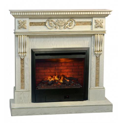 Выполнен портал каминокомплекта из материала МДФ, отличающегося структурой, схожей с натуральной древесиной. Это обеспечивает схожие характеристики – плотность, прочность, возможность резной обработки. Особенностью же материала является более высокая устойчивость к перепадам таких параметров микроклимата как влажность и температура. За счет этого обеспечивается более высокая долговечность изделия – поверхность портала не покроется трещинами в процессе эксплуатации. Дополнительную защиту материала обеспечивает слой экошпона. За счет имитации фактуры и цвета белого дуба обеспечиваются высокие декоративные характеристики изделия.