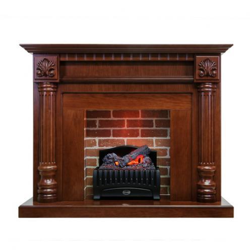 Портал каминокомплекта выполнен в строгом и сдержанном классическом стиле. Несмотря на классический вид, он отличается не слишком богатым декором. В оформлении выделяются массивные полуколонны на боковых панелях, по поверхности которых протянуты вертикальные каннелюры. Сверху над колоннами расположены вставки, украшенные резными консолями, в оформлении которых использованы растительные мотивы. Колонны визуально подпирают каминную крышку, кромка которой имеет ступенчатую конструкцию. Верхняя панель, расположенная над очагом, оформлена геометрическим фризом. Заканчивает общий вид невысокое основание, которое также придает изделию большую устойчивость.