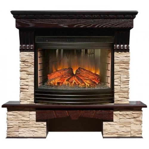 Выполнен портал каминокомплекта из современных материалов, имитирующих натуральный камень и дерево. При этом по качеству и декоративным характеристикам они не уступают натуральным материалам. Каркас портала собран из МДФ, плотность которого обеспечивает достаточно высокую жесткость всей конструкции. Сверху осуществляется облицовка из искусственного камня, имитирующего собой пиленый скальник. Колотая фактура камня придает определенный шарм конструкции. Декоративные элементы и каминная полка каминокомплекта выполнены из МДФ. Сверху он покрыт натуральным экошпоном, имитирующим фактуру и цвет древесины. Всего на выбор представлено два варианта цвета: темный дуб и венге.