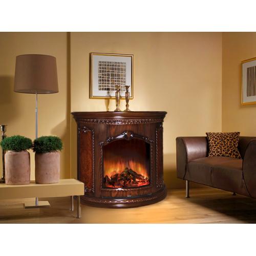 Каминокомплект классического дизайна, топка имеет панорамную полукруглую форму, яркий эффект горения дров.