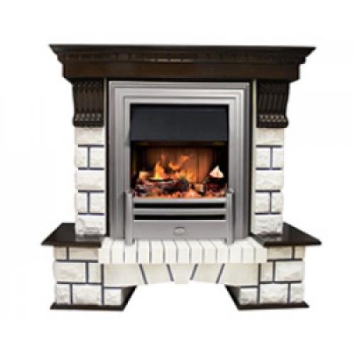Сверху портал венчает широкая каминная крышка, украшенная мощным карнизом. По карнизу нанесен фигурный резной рисунок. Крышка выглядит мощно, поэтому на боковых сторонах фасада имеются декоративные элементы, выполненные в виде консолей, поддерживающих ее. Уровень очага оформлен полочками, а непосредственно зона очага подчеркнута кладкой из настоящего шамотного камня. Основание очага выполнено в виде ниши для дров. Для максимальной схожести этого каминокомплекта с настоящим дровяным камином, в нишу можно уложить настоящие Муляж дров.