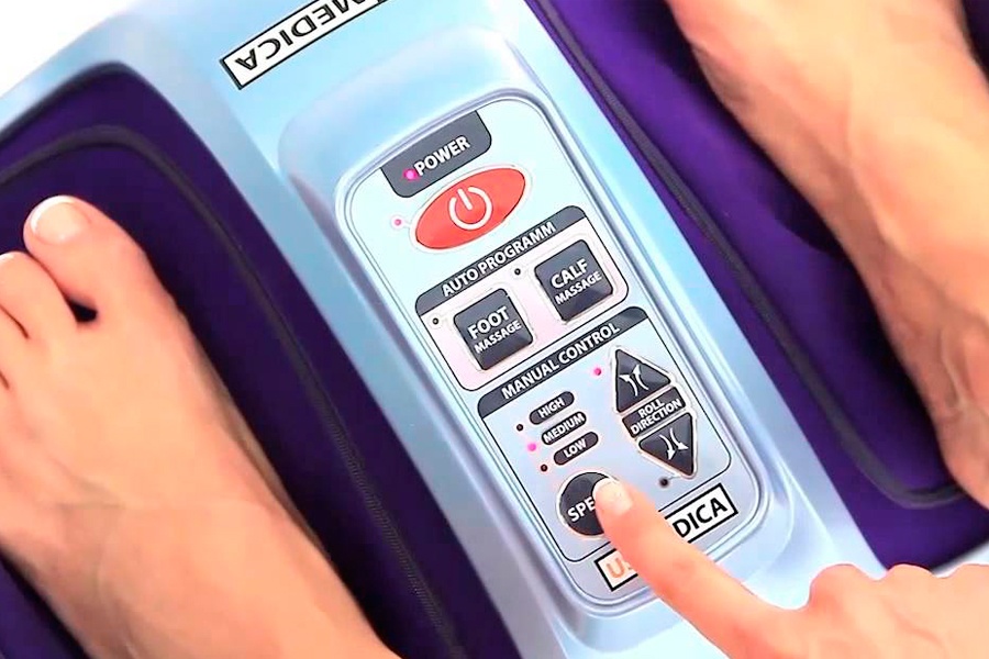Панель управления, расположенная на основании массажера, позволяет выбрать режим воздействия, интенсивность, направление движения массажных головок. Предусмотрены два автоматических режима для стоп и икр. Устойчивое основание прибора позволяет разместить его в любом удобном месте.