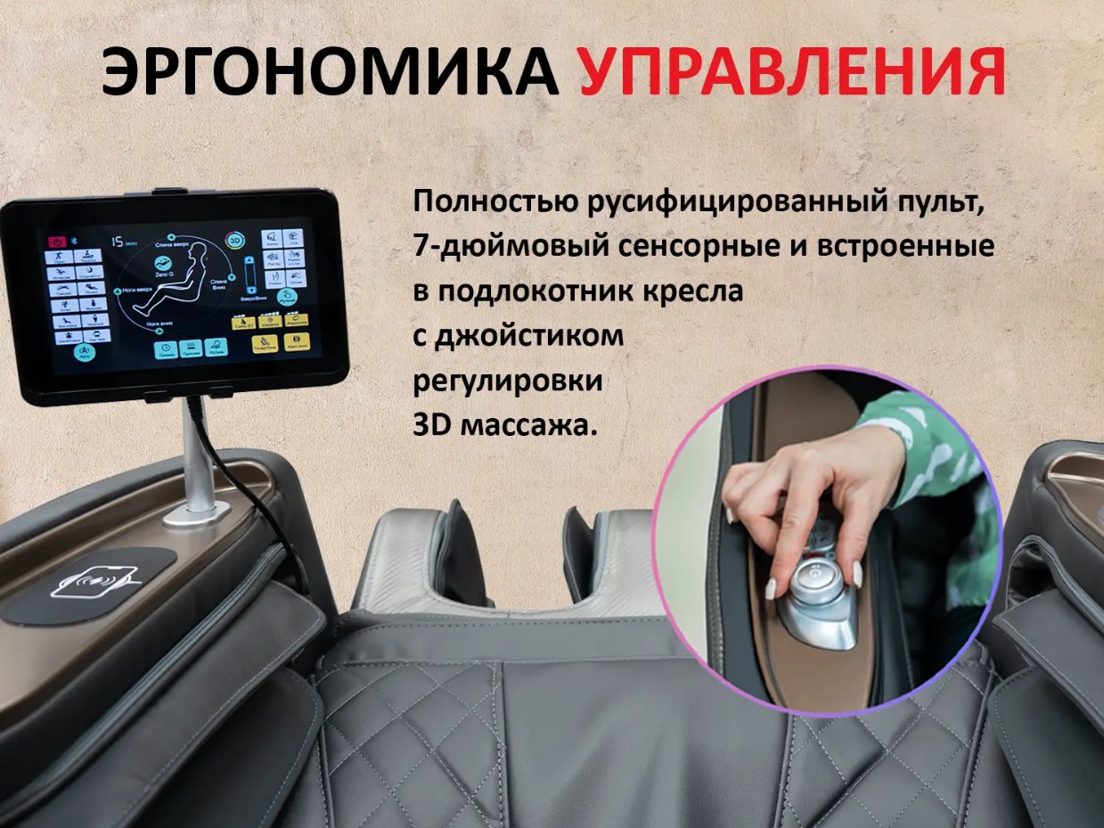 Кресло KENKO оснащено полностью русифицированным сенсорным пультом с 7-дюймовым экраном и встроенной в подлокотник панелью управления с джойстиком регулировки 3D массажа.Габаритные размеры Fujimo Kenko