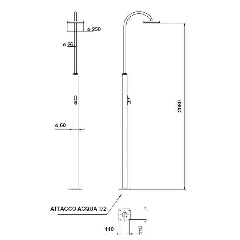 Высота от пола до лейки 2080мм; диаметр лейки 250мм; Один режим "дождь".