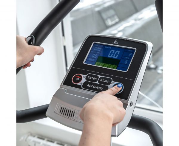 Функция измерения пульса реализуется при помощи датчиков на поручнях. Если необходим более точный контроль, стоит приобрести нагрудный кардиодатчик + часы-монитор DFC W117. Монохромный LCD монитор с синей и зелёной подсветкой отображает пульс, скорость, расстояние и другие параметры занятия. Предусмотрена 21 программа тренировок. На консоли также имеется подставка под телефон или планшет.